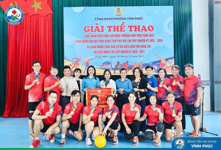 Sáng ngày 20/12/2025, Bệnh viện Đa khoa Vĩnh Phúc tham gia “Giải thể thao công nhân, viên chức, người lao động phường Vĩnh Phúc năm 2025 chào mừng Đại hội Công đoàn tỉnh Phú Thọ lần thứ I nhiệm kỳ 2025 - 2030 và hướng tới cuộc bầu cử Đại biểu Quốc hội khóa XVI, Đại biểu Hội đồng nhân dân các cấp nhiệm kỳ 2026 - 2031”. Với tinh thần thi đấu nỗ lực đội bóng chuyền hơi nam - nữ của Bệnh viện đã xuất sắc giành Giải Ba và Giải vận động viên nam xuất sắc nhất.
