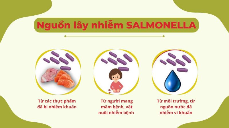 Thức ăn và nước uống bị nhiễm vi khuẩn Salmonella: Thịt, gia cầm, trứng và hải sản sống, sữa chưa tiệt trùng, rau củ trái cây sống, thực phẩm được bảo quản và xử lý không đúng cách…