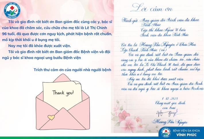 Lá thư tri ân không chỉ là lời cảm ơn chân thành của người bệnh và gia đình, mà còn là nguồn động viên tinh thần to lớn đối với tập thể cán bộ, nhân viên y tế của Bệnh viện Đa khoa Vĩnh Phúc, đặc biệt là đội ngũ Khoa Ngoại ung bướu – những người luôn âm thầm nỗ lực từng ngày, tận tụy vì sức khỏe và sự sống của người bệnh.